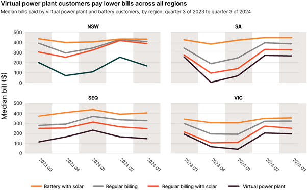 The report also highlights the growing role of virtual power plants, with households that combine solar, batteries and VPP participation paying the lowest power bills in the country.