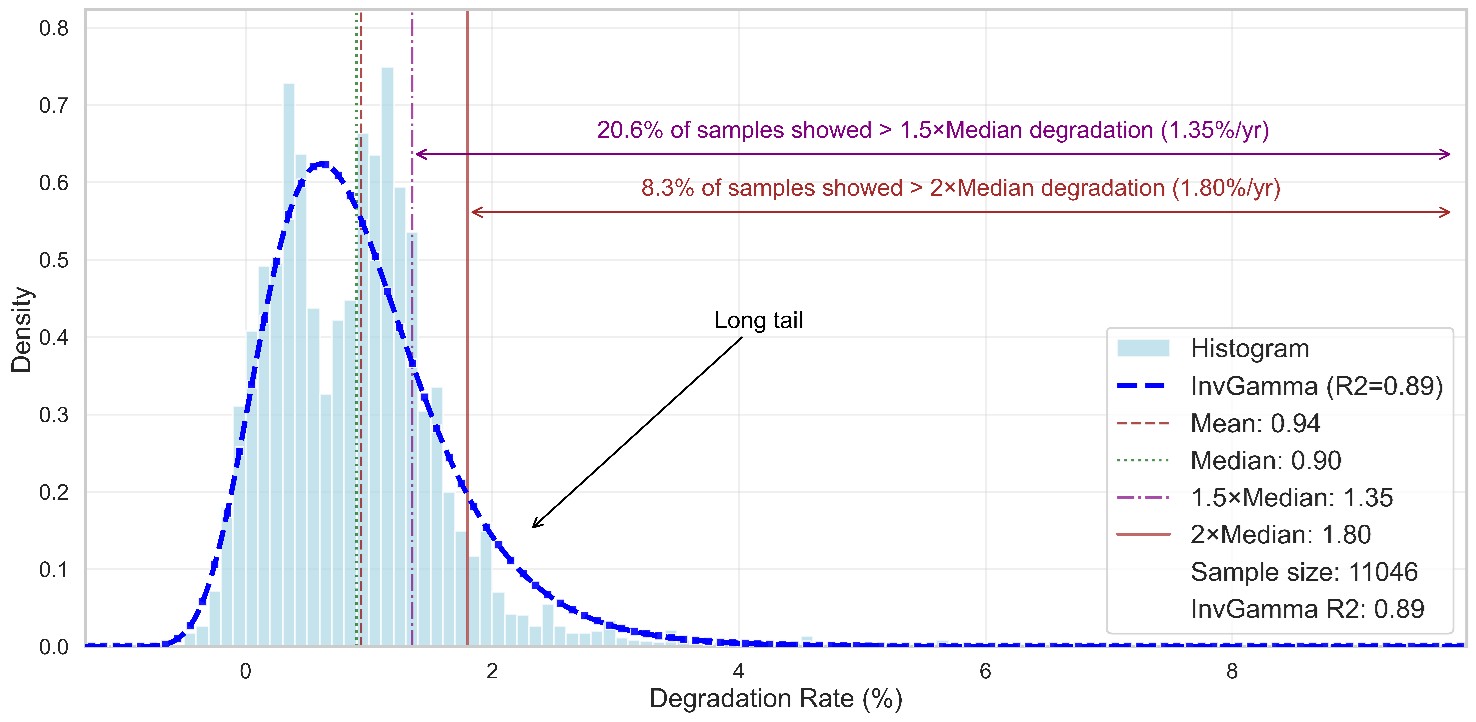 After analysing performance data from nearly 11,000 photovoltaic systems worldwide, researchers identified a “long tail” in degradation rates. While the average system loses about 0.9% of output per year, up to 20% of panels degrade at least 1.5 times faster and around one in 12 degrade twice as fast.